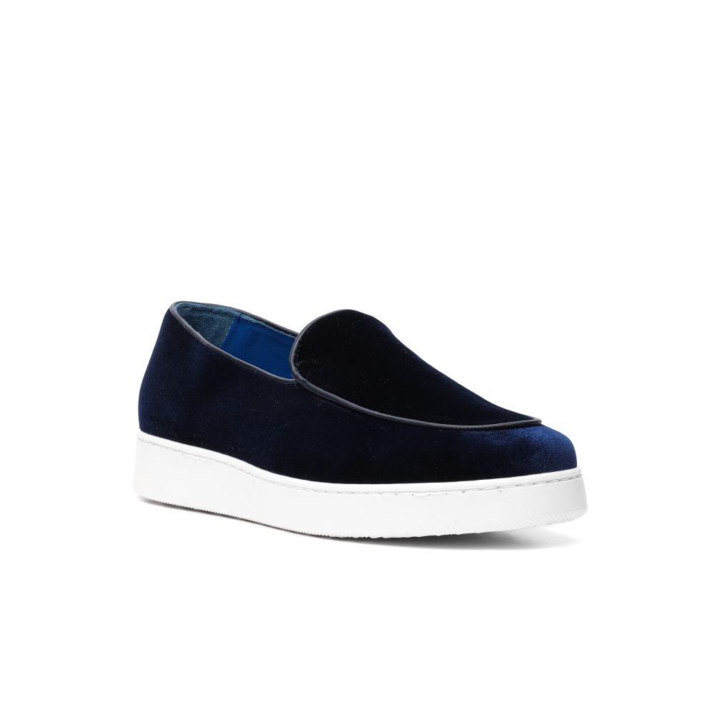 Realizzata in velluto e pelle di vitello tinta a mano interno foderato in pelle blu cobalto. Suola bianca con cucitura perimetrale e fondo antiscivolo.