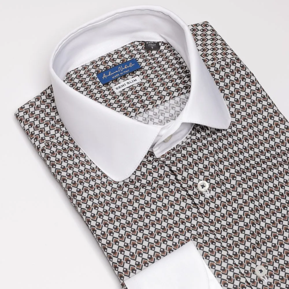Camicia Made in Italy, resa particolare dalla fantasia geometrica nel colore rosa, marrone e blu su base grigia.
