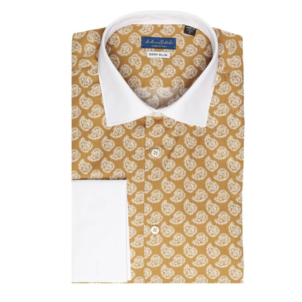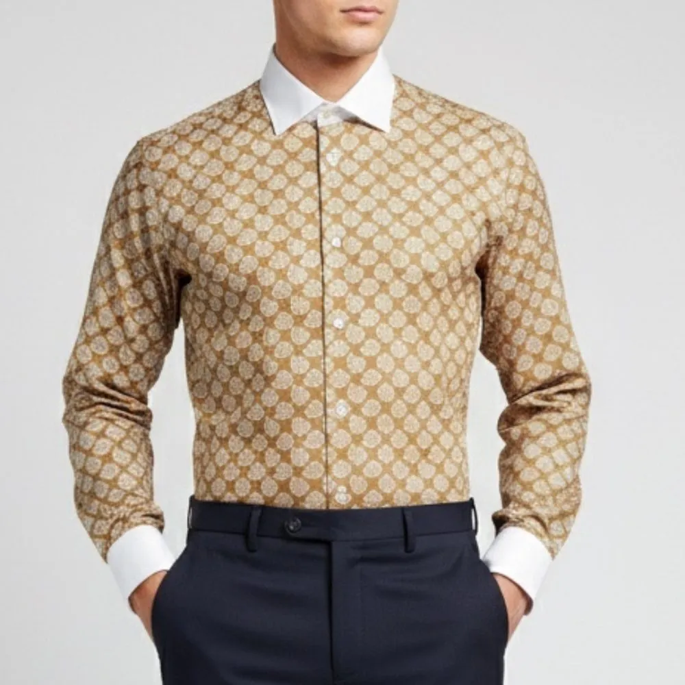 Camicia Made in Italy, resa particolare dalla fantasia tribale nel colore bianco su base giallo ocra.