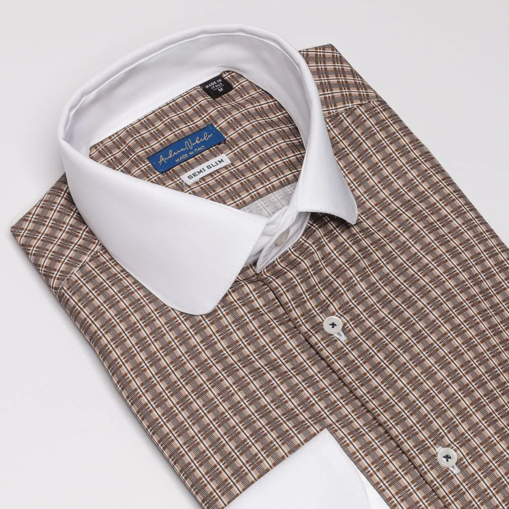 Italiensk skjorta, unik genom det geometriska mönstret i beige, grönt och lila med grå ränder.