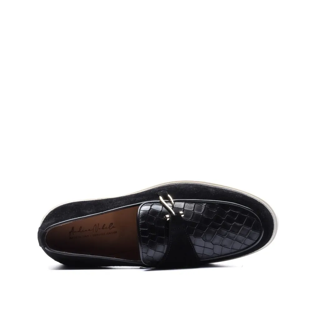 Ginawa mula sa malambot na itim na suede na may tone-on-tone crocodile-effect na naka-print na leather vamp, ang sapatos na ito ay ekspertong pinagsasama ang sartorial taste at kontemporaryong kaginhawaan.